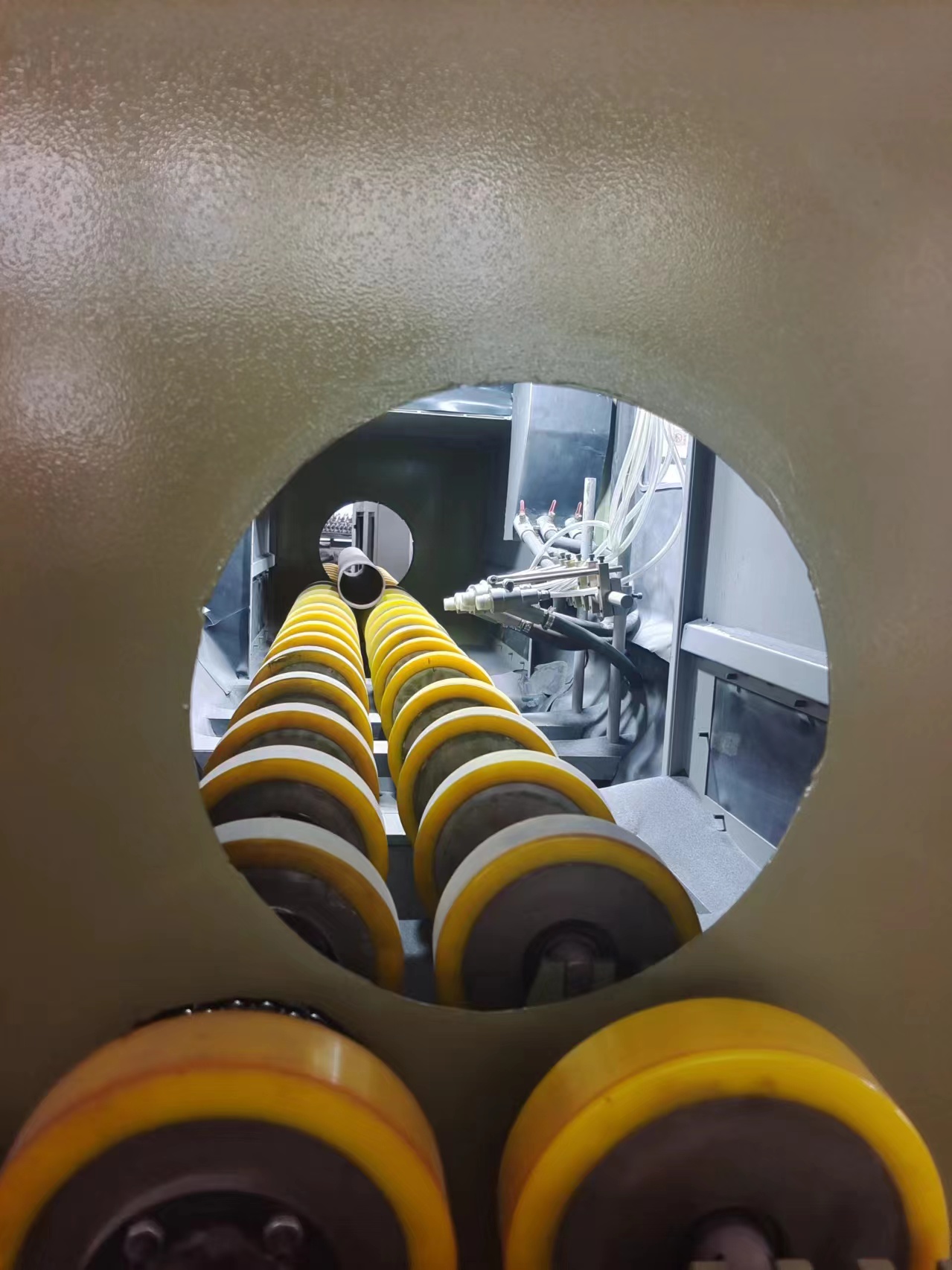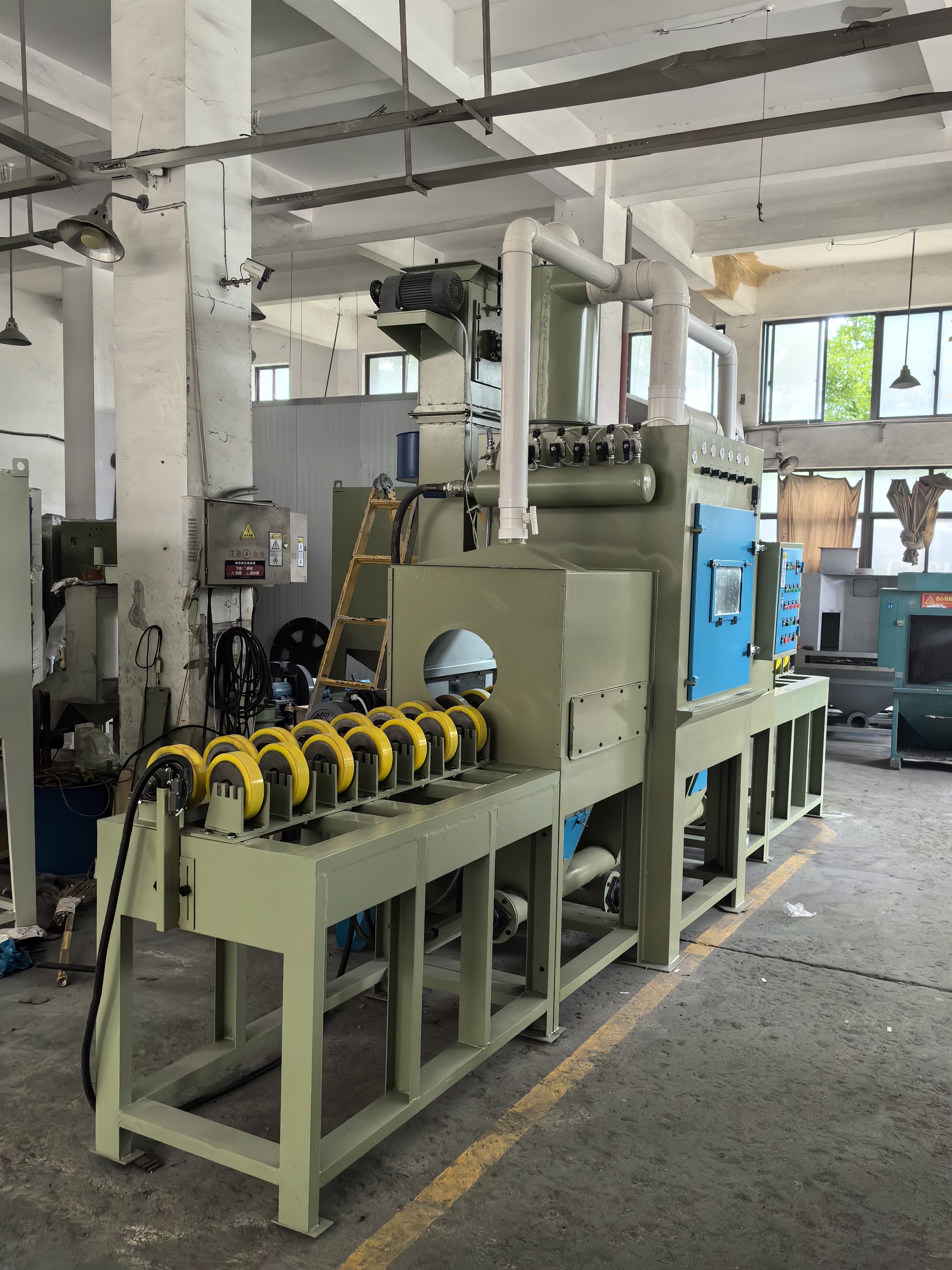 本類(lèi)機(jī)型適用于,管件,輥軸類(lèi)圓柱形工件的表面處理噴砂工藝。 材質(zhì)不限如:鐵管、